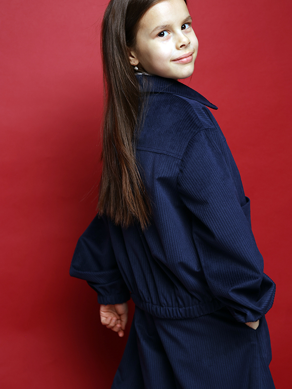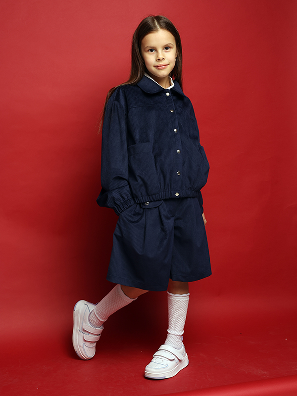 Свободный вельветовый жакет с отложным воротником, накладными карманами и резинкой по низу изделия и на рукавах. Застегивается на кнопки.