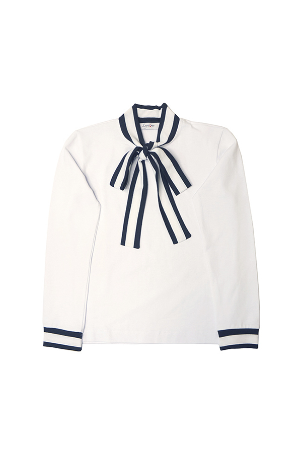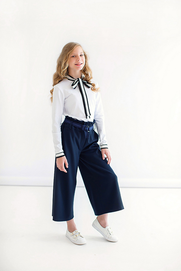 Трикотажная белая школьная блузка с контрастным бантом и манжетами