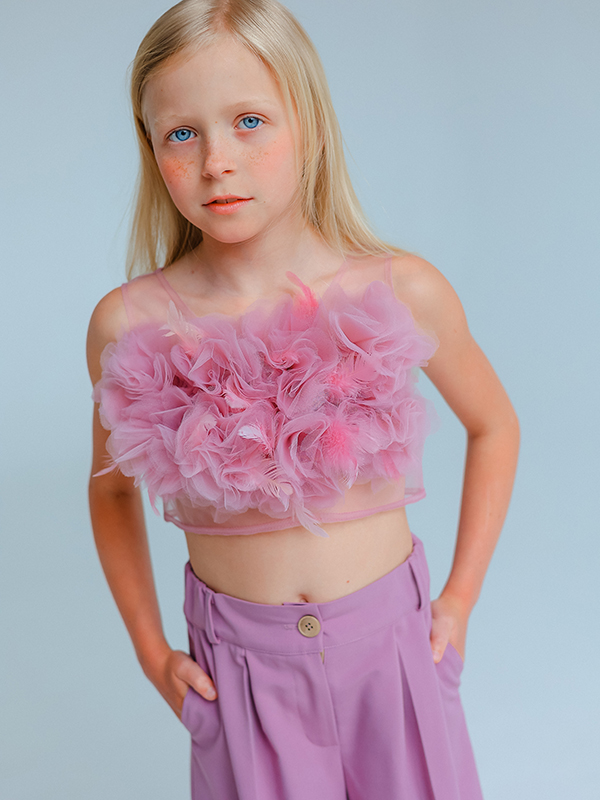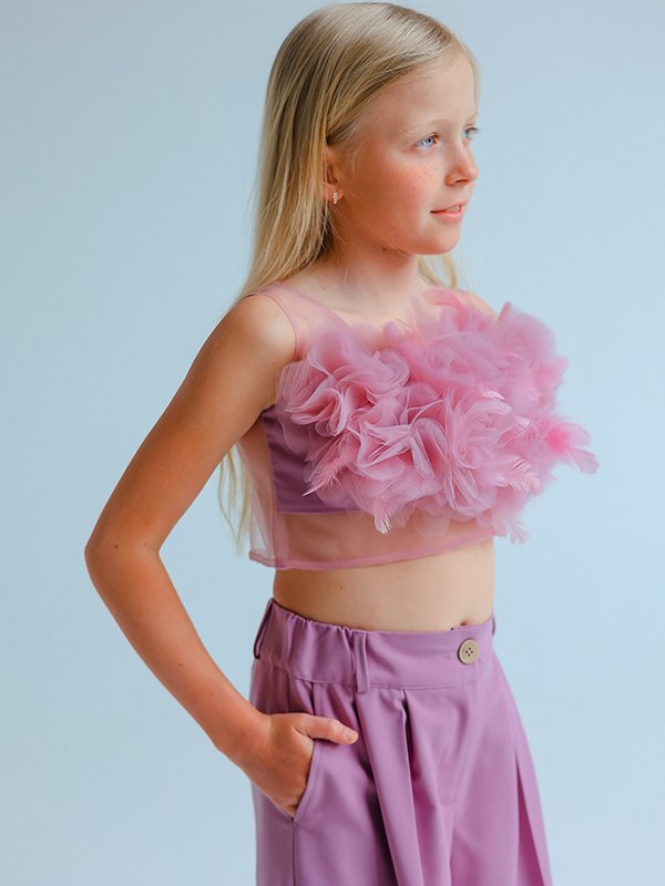 Нарядный комплект из широких струящихся брюк со складками и укороченного топа с объемным цветочным декором в культовом пудрово-розовом цвете