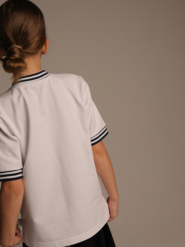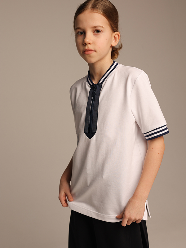 Белая футболка из плотной ткани свободного кроя с разрезами по бокам, контрастным воротником и манжетами,застежкой на молнию и декоративной отстрочкой из репсовой ленты в виде галстука