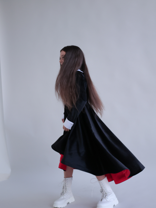 Королевское платье из черного бархата и красного атласа, с юбкой со шлейфом и контрастными белыми воротником и манжетами. В комплекте гаслтук из бархатных лент, застежка на металлическую молнию.