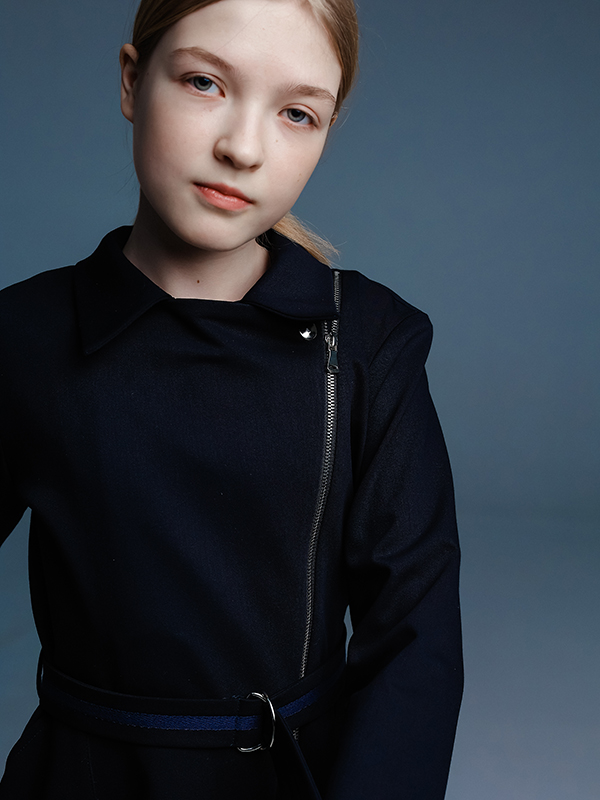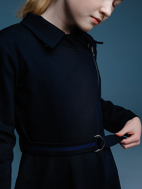 Синее школьное платье-косуха с асимметричной застежкой на металлическую молнию. Длинный рукав. Расклешенная юбка миди с накладными карманами, пояс с полукольцами