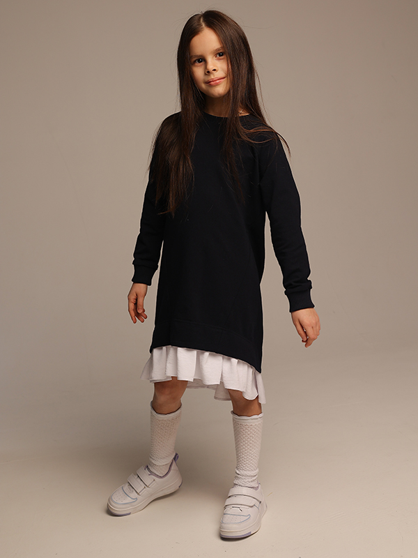 Синее трикотажное платье-туника из хлопка (футер двухнитка петля) с вставкой из белой ткани и белой оборкой по низу изделия. Наш проверенный временем хит теперь и в школьном варианте. Не линяет. Садится на любую фигуру. Очень удобное и комфортное платье