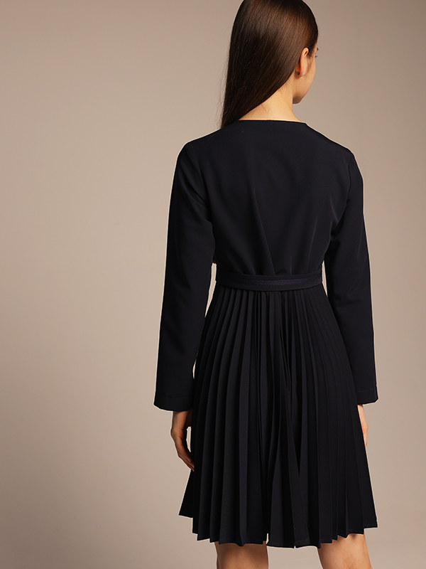 Платье из костюмной ткани с длинным рукавом с плиссированной юбкой, лиф оформлен клапанами с пуговицами в стиле Шанель. Застегивается на пуговицы. Объем по талии регулируется поясом.