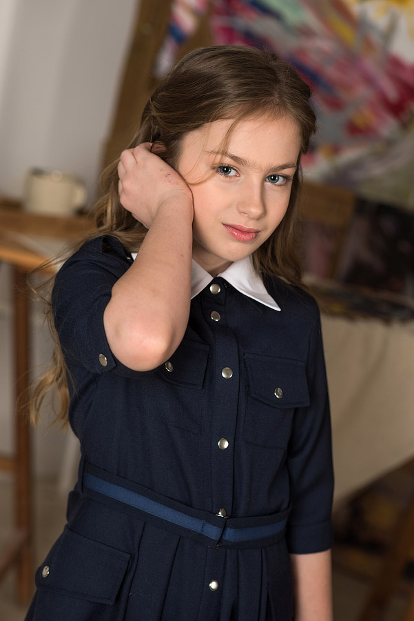 Синее школьное платье-рубашка с расклешенной юбкой, с накладными карманами и съемным белым воротником, застегивается на кнопки. Объем по талии регулируется поясом