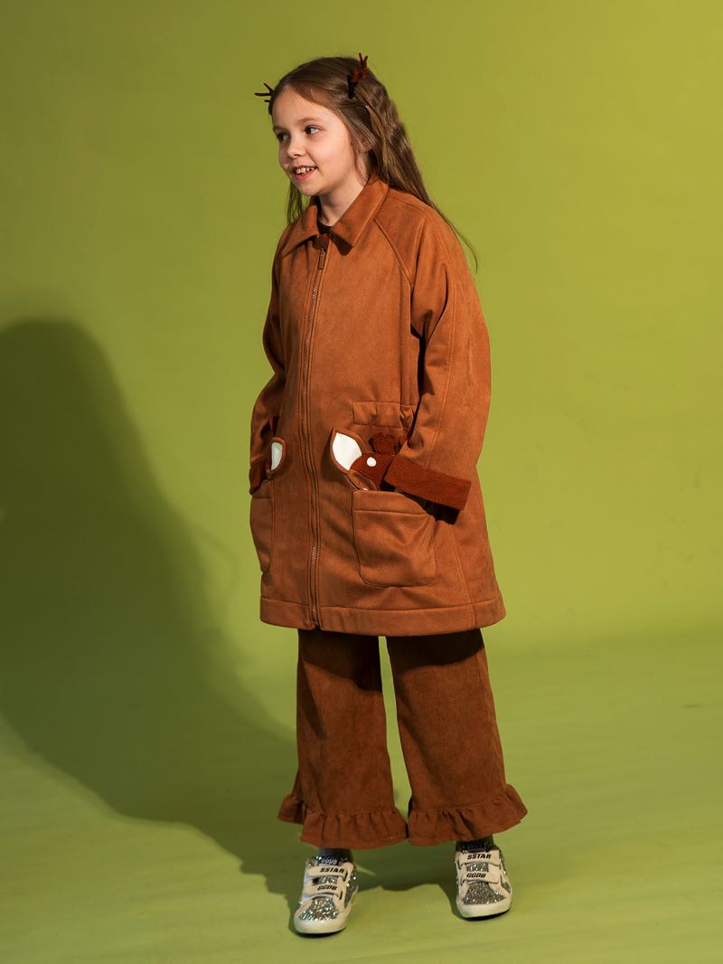Парка из искусственной замши без подкладки (так как есть внутренняя флисовая основа) с затяжником по линии талии (можно регулировать объем). Деталь — клапаны карманов в виде мордочек очаровательных оленят. Низ рукава фиксируется манжетой.