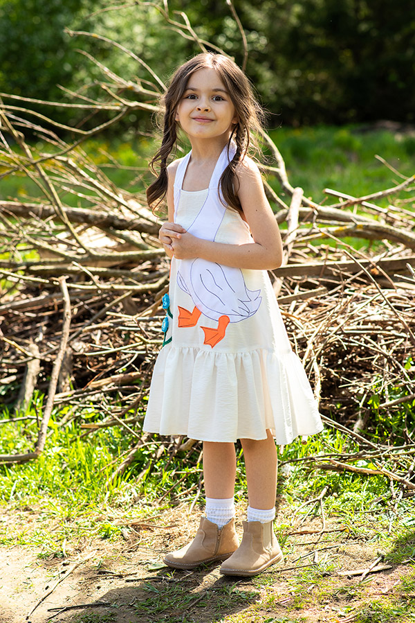 Яркий и необычный летний белый нарядный детский сарафан с открытыми плечами и спиной из жатой вискозы с аппликацией в виде белого гуся и цветов