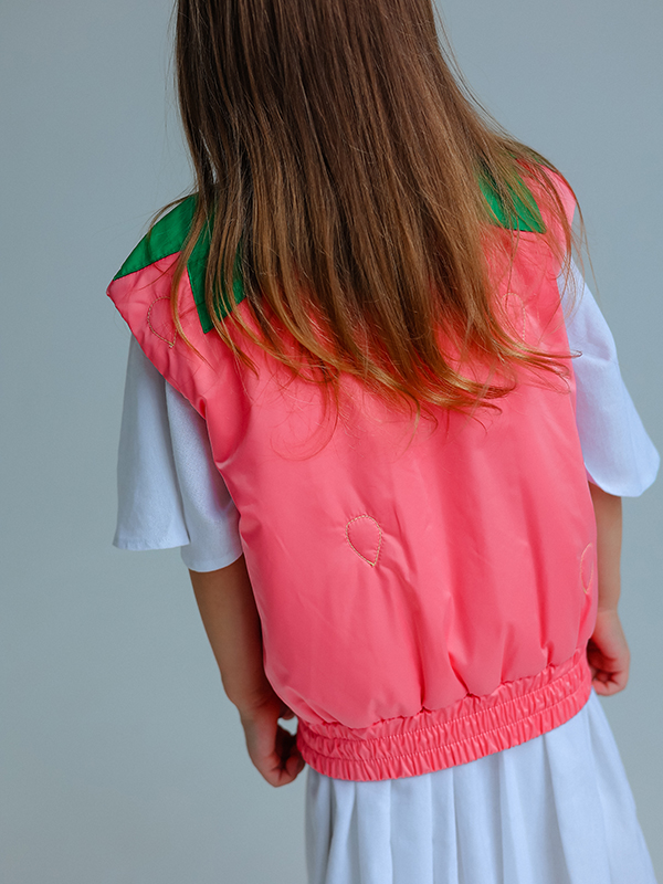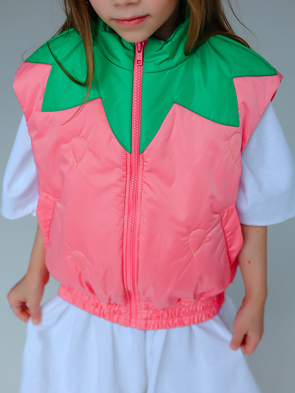 Необычный стеганый розовый детский жилет «Клубника» на девочку на молнии с эластичным поясом по низу. С утеплителем, подкладкой из вискозы. Боковые карманы, воротник-стойка