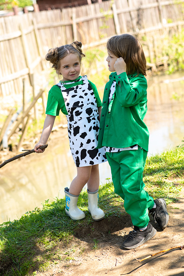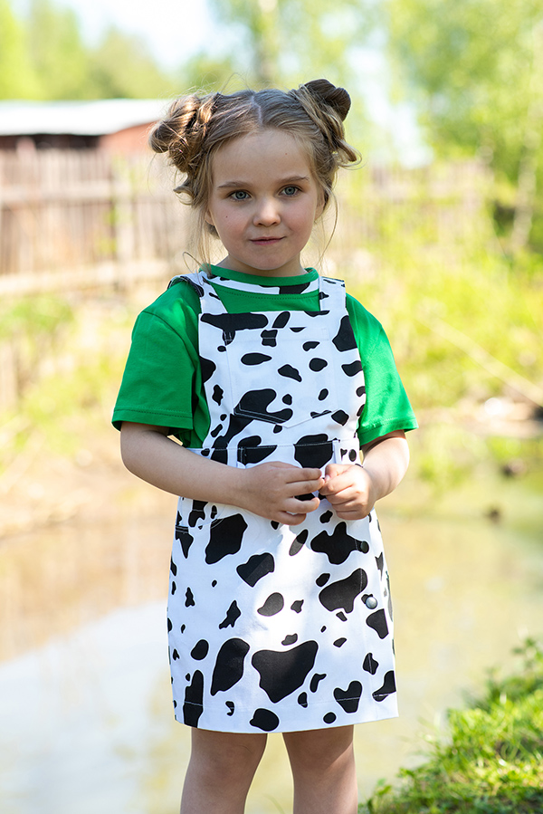 Черно-белый принтованный летний джинсовый детский сарафан "Корова"
