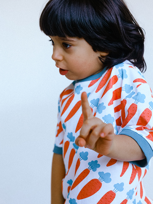Яркая летняя футболка из хлопка с ассиметричным принтом в виде рядов морвкови и контрастными окантовками