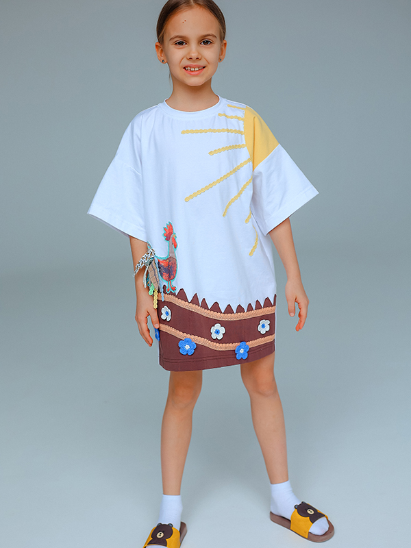 Белое детское платье-футболка из хлопка с аппликацией «Солнце взойдет»
