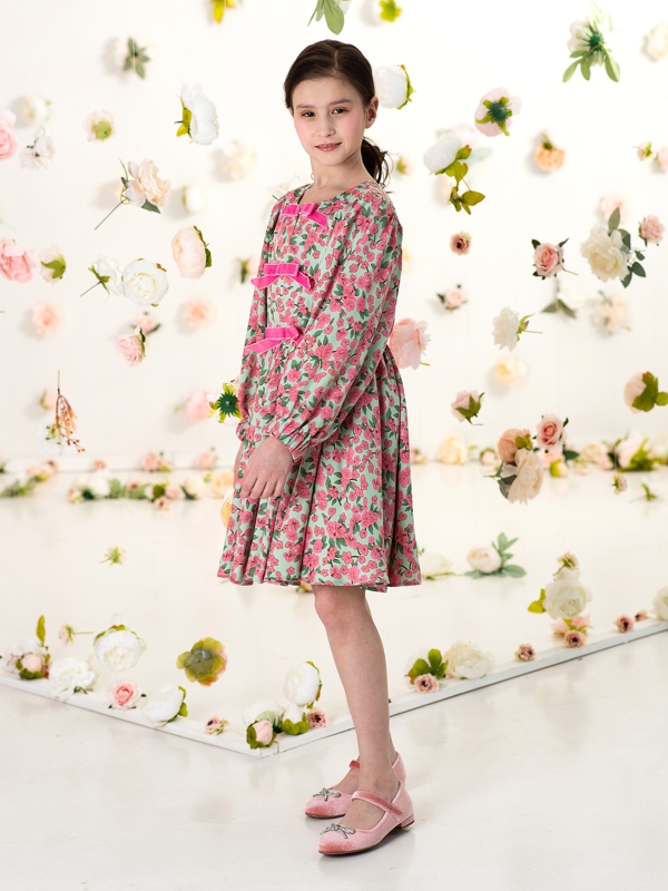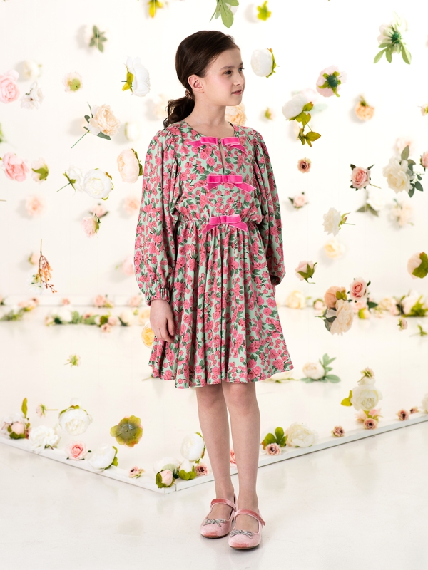 Уникальный дизайн: Сочетание мятного фона, принта с розами, бархатных бантов и драпированных рукавов создает запоминающийся, нежный образ с винтажными нотками.
