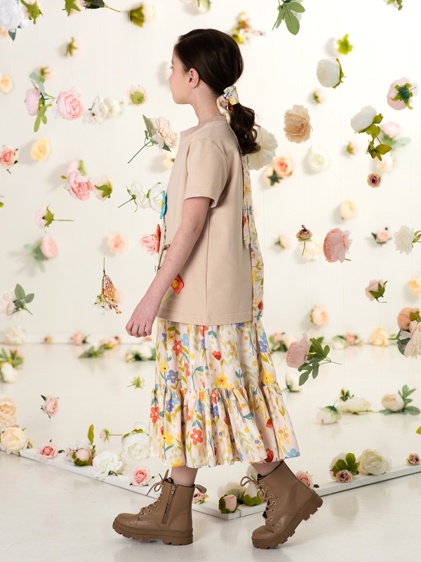 Благодаря натуральному составу, футболка хорошо пропускает воздух и приятна к коже. Она идеально подойдет для прогулок, игр и повседневной носки, легко сочетаясь с джинсами, леггинсами или шортами. Эта бежевая футболка с цветами — прекрасный выбор для девочек, ценящих удобство и нежный стиль.