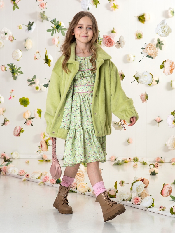Куртка-бомбер выполнена из практичных материалов: верх из комбинации вискозы и полиэстера, а подклад из натуральной вискозы. Такое сочетание обеспечивает износостойкость и легкость в уходе. Эта зеленая пушистая куртка станет любимой вещью в гардеробе вашей девочки и будет привлекать внимание своим милым и стильным видом