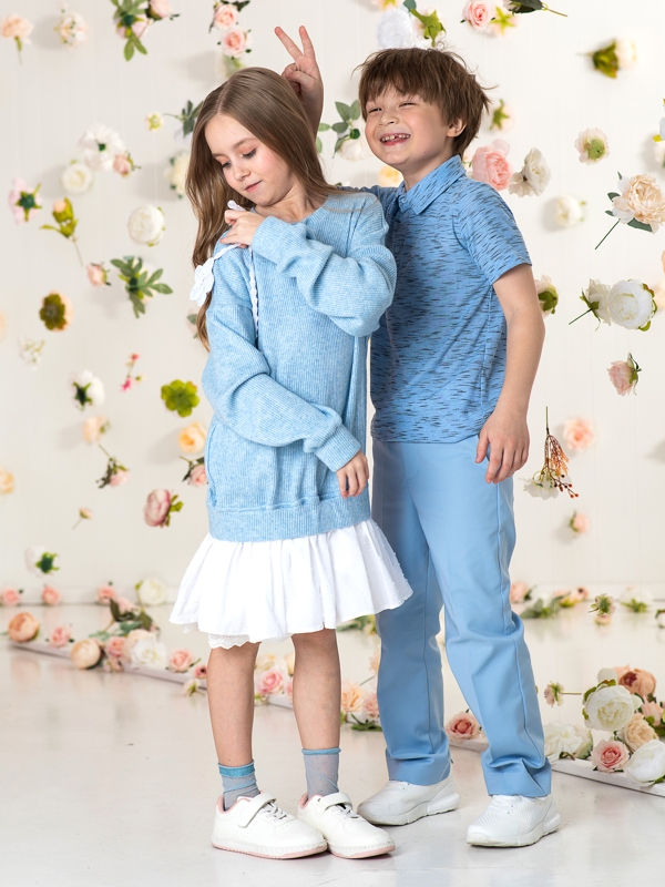 Голубое вязаное платье-туника привлекает внимание своим необычным дизайном, создавая иллюзию комплекта из свитшота и юбки. Верхняя часть сделана из мягкого, приятного на ощупь вязаного полотна (90% вискоза, 10% полиэстер), а пышная юбочка выглядит как легкое шитье с воланами.
