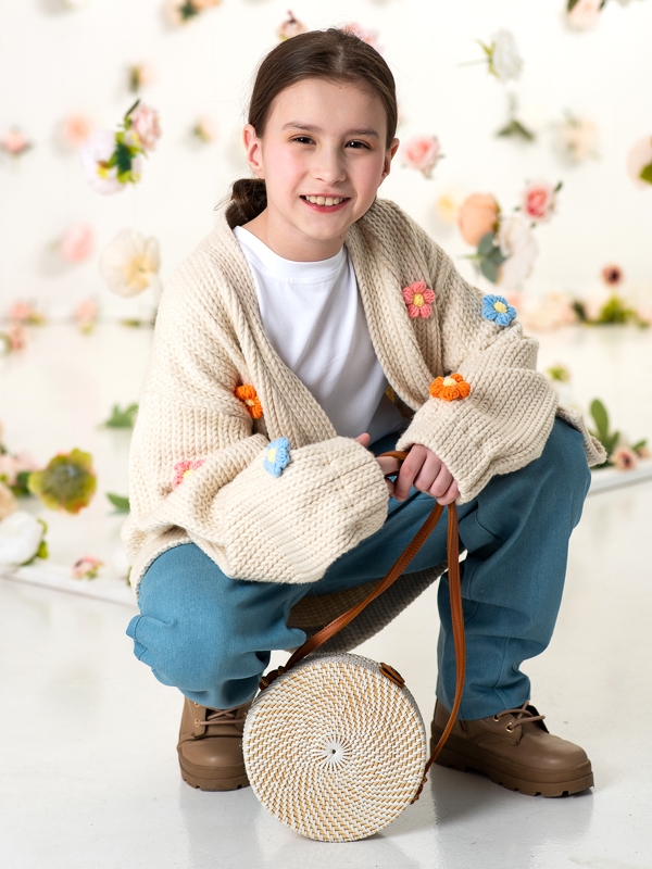 Благодаря свободному крою и отсутствию застежек, этот бежевый кардиган легко накинуть поверх любой одежды, будь то платье или джинсы с футболкой. Этот детский кардиган с цветами выглядит очень стильно и добавляет уюта любому образу.