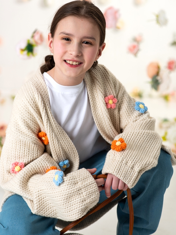 Такой вязаный кардиган долго прослужит, сохраняя свою мягкость и привлекательность. Его нежная расцветка и красивый цветочный декор точно будут привлекать взгляды, делая образ вашей девочки запоминающимся.