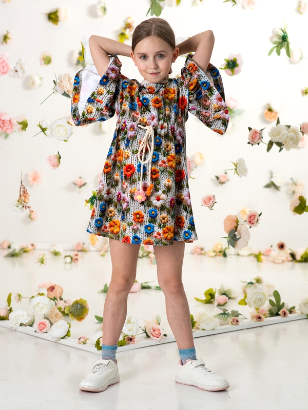 Яркое детское платье-туника для девочки с нежным цветочным принтом сделано из мягкого и уютного футера (95% хлопок, 5% эластан). В нем будет очень удобно и комфортно благодаря приятной ткани и продуманному крою с рукавами-фонариками.
