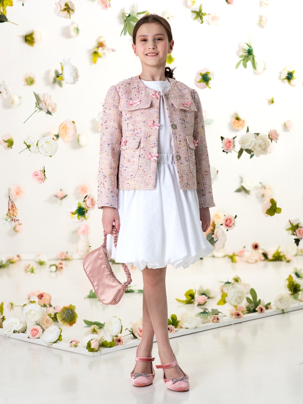 Элегантный жакет для девочки в стиле Шанель сделан из красивого фактурного твида нежного бежево-розового оттенка. Мелкие пайетки вплетены в ткань, создавая деликатное, изысканное мерцание. Мягкая подкладка из 100% вискозы приятна к телу, в жакете будет комфортно.