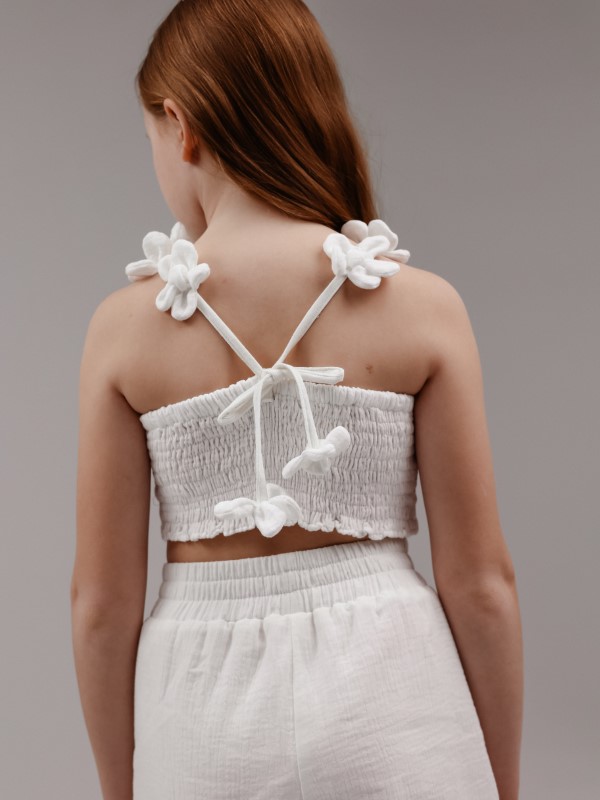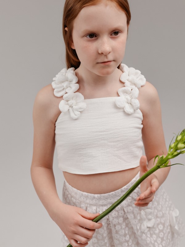 Этот кроп-топ из 100% хлопкового муслина в чистом белом цвете сочетает невесомую, почти невесомую текстуру ткани с эластичной спинкой, которая идеально облегает фигуру и не стесняет движений. Главный акцент — объемные цветы на бретелях, которые выглядят как живые и добавляют романтичный объем. Бретели регулируются по длине, чтобы посадка была идеальной. Натуральный хлопок дарит потрясающую мягкость, отличную воздухопроницаемость и комфорт даже в жару.