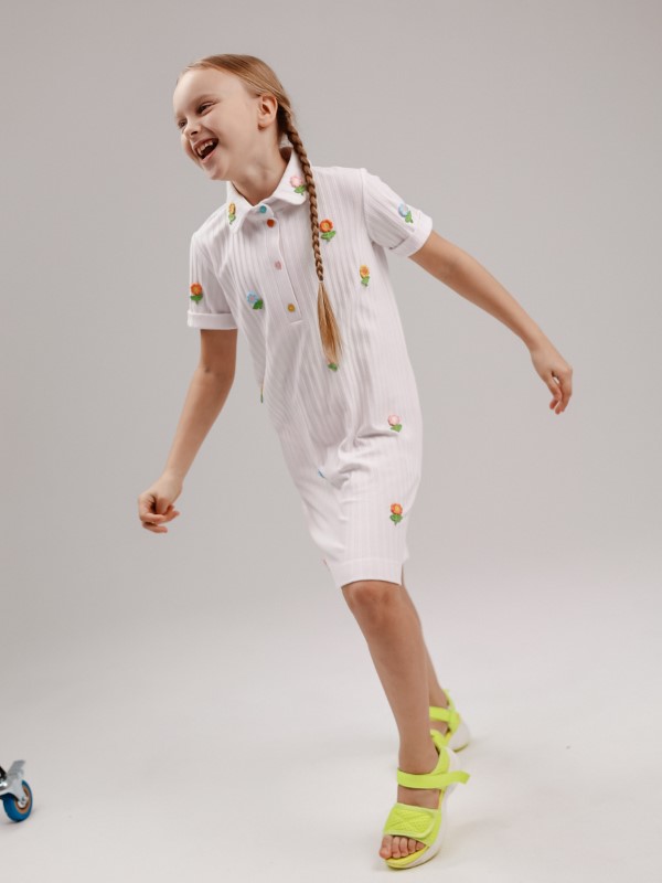 Это хлопковое платье-поло белого цвета в рубчик — воплощение комфорта и яркости для стильных повседневных луков. Сшитое из 95% хлопка и 5% эластана, оно обеспечивает эластичность, дышащесть и идеальную посадку, не сковывая движения даже в активный день. Разноцветные нашивки в виде цветов на лифе добавляют игривый, multicolored акцент, делая платье подходящим для прогулок, встреч или casual-офиса. Белый фон подчеркивает свежесть, а рубчик придает текстуру и объем. Гипоаллергенное, прочное и легкое в уходе — must-have для весенне-летнего гардероба!