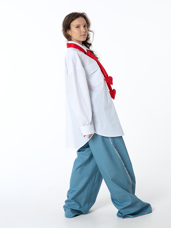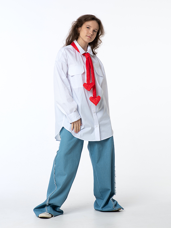 Эта рубашка такая свободная и удобная, что в ней можно танцевать, мечтать и строить планы на будущее! А галстук с сердечками – это как послание о любви и дружбе, которое можно повязать как угодно – на шею или даже на сумку.