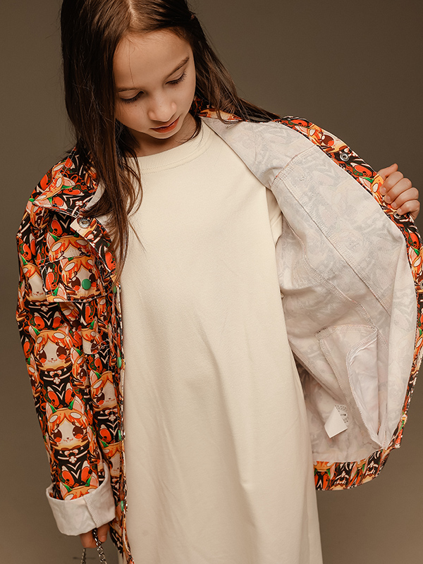 Яркая оранжевая свободная куртка из джинсы для девочек с принтом аниме в уличном стиле. Боковые и нагрудные карманы, без подкладки. Застежка на кнопки