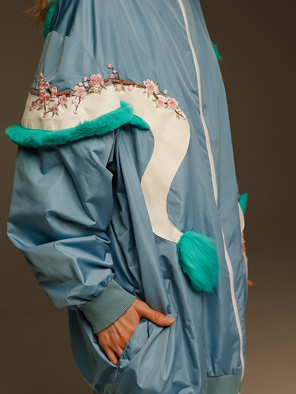 Голубая куртка-бомбер объемного кроя с аппликацией в виде дракона Хаку из аниме «Унесенные призраками», с боковыми карманами. Застегивается на молнию. Подкладка из спортивной сетки