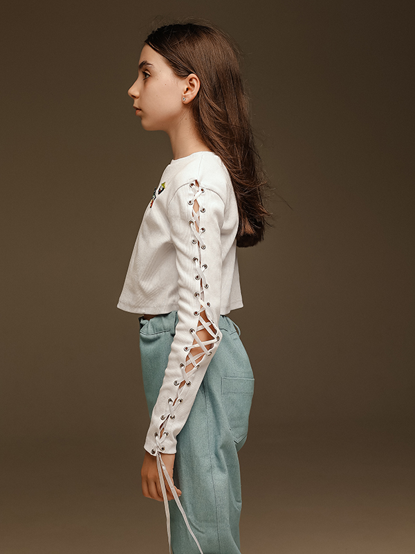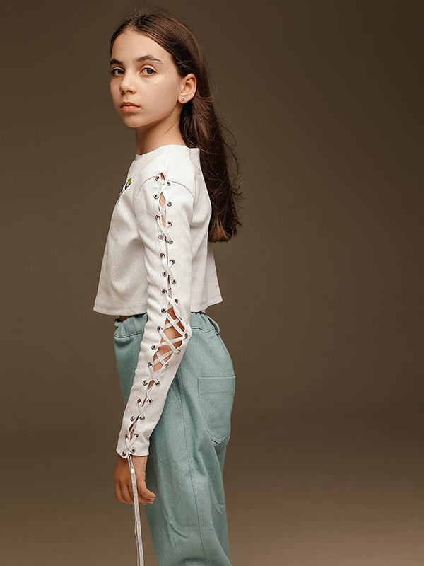 Укороченный белый детский топ в рубчик с длинным рукавом со шнуровкой, в комплекте значки с героями аниме
