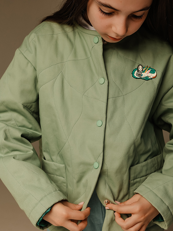 Куртка оверсайз фисташкового цвета из джинсы с фигурной стежкой-имитацией листьев на вискозной цветочной подкладке, застегивается на кнопки. Без воротника. С накладными карманами