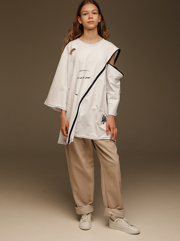 Бежевые джинсы-бананы на девочку, зауженные книзу из плотной хлопковой джинсы с декоративной деталью — имитацией резинки от нижнего белья на поясе. С боковыми карманами.